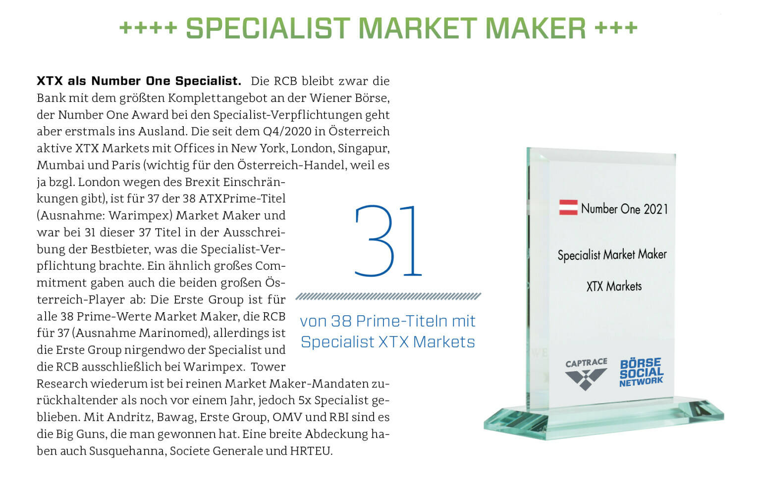 XTX als Number One Specialist. Die RCB bleibt zwar die Bank mit dem größten Komplettangebot an der Wiener Börse, der Number One Award bei den Specialist-Verpflichtungen geht aber erstmals ins Ausland. Die seit dem Q4/2020 in Österreich aktive XTX Markets mit Offices in New York, London, Singapur, Mumbai und Paris (wichtig für den Österreich-Handel, weil es ja bzgl. London wegen des Brexit Einschränkungen gibt), ist für 37 der 38 ATXPrime-Titel (Ausnahme: Warimpex) Market Maker und war bei 31 dieser 37 Titel in der Ausschreibung der Bestbieter, was die Specialist-Verpflichtung brachte. Ein ähnlich großes Commitment gaben auch die beiden großen Österreich-Player ab: Die Erste Group ist für alle 38 Prime-Werte Market Maker, die RCB für 37 (Ausnahme Marinomed), allerdings ist die Erste Group nirgendwo der Specialist und die RCB ausschließlich bei Warimpex. Tower Research wiederum ist bei reinen Market Maker-Mandaten zurückhaltender als noch vor einem Jahr, jedoch 5x Specialist geblieben. Mit Andritz, Bawag, Erste Group, OMV und RBI sind es die Big Guns, die man gewonnen hat. Eine breite Abdeckung haben auch Susquehanna, Societe Generale und HRTEU.