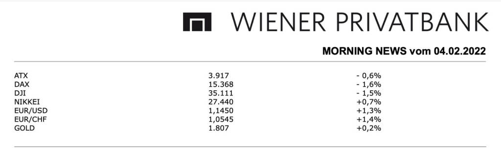 Aus den Morning News der Wiener Privatbank: Die heimische Börse musste gestern nachgeben, das Minus fiel für den ATX aber mit 0,6% geringer aus als an den großen europäischen Börsen. Auch in Wien reagierten die Sorgen um eine mögliche Zinsanhebung noch in diesem Jahr, ansonsten bestimmten weitgehend Unternehmensergebnisse das Geschehen. AT&S präsentierte Quartalszahlen, die die Erwartungen der Analysten sowohl beim Umsatz als auch beim Gewinn deutlich übertroffen haben, zudem erhöhte der Leiterplattenhersteller erneut die Prognose für das Gesamtjahr, die Aktie reagierte auf diese Nachrichten mit einem Anstieg von 6,8%. OMV hingegen musste nach der Ergebnispräsentation um 2,5% nachgeben, die Ergebnisse für das vierte Quartal lagen leicht unter den Erwartungen, insgesamt verlief das Jahr aber sehr zufriedenstellend für den Ölkonzern. Frequentis beendete gestern den Handel mit einem Minus von 0,4%, angesichts der großen Kursbewegungen in letzter Zeit erstaunlich gering verändert, das auf Flugkommunikation spezialisierte Wiener Unternehmen hat sich nach vorläufigen ungeprüften Zahlen im Jahr 2021 deutlich verbessert, der Umsatz stieg von 299,4 Millionen Euro im Jahr 2020 auf mehr als 330 Millionen Euro, das operative Ergebnis erhöhte sich voraussichtlich auf rund 28 Millionen Euro, nach 26,8 Millionen Euro im Jahr davor. Einen deutlichen Anstieg von 7,8% gab es für FACC, der Luftfahrtspezialist sucht für Oberösterreich 200 neue Mitarbeiter, da sich die Auftragslage eindeutig positiv entwickelt hat.