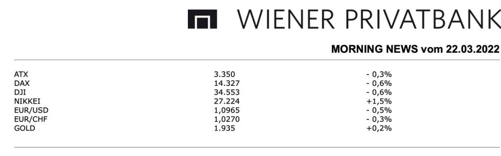 Aus den Morning News der Wiener Privatbank: Einen leichten Rückgang gab es für den heimischen Markt, nachdem der ATX über weite Strecken des Tages mit leichten Zuwächsen gehandelt worden war, drehte sich gegen Ende die Stimmung und das heimische Börsenbarometer musste mit einem Abschlag von 0,3% aus dem ersten Handelstag der Woche gehen. Unternehmensnachrichten waren gestern wieder einmal eher Mangelware, im Fokus des Interesses standen zwei Analystenmeinungen, die Erste Group senkte das Kursziel für CA Immo von 43,0 Euro auf 34,0 Euro, bestätigte aber die Anlageempfehlung „Accumulate“, für den Immobilienkonzern, der im Laufe der Woche Ergebnisse vorlegen wird, ging es um 0,7% nach unten. Raiffeisen Research kürzte das Kursziel für die Österreichische Post von 43,0 Euro auf 36,0 Euro, hielt aber an der bisherigen Einstufung des Titels als „Hold“ fest, für das Logistikunternehmen ging es um 0,5% nach unten. Voestalpine profitierte von den guten Zahlen und der hohen angekündigten Dividende des deutschen Konkurrenten Salzgitter und konnte einen Anstieg von 1,8% erzielen. Unterschiedlich verlief der Handel für die Bankenwerte, die Bawag musste relativ deutlich um 2,2% nachgeben, für die Erste Group ging es um 1,5% nach unten, die Raiffeisen Bank International hingegen konnte sich um 1,9% verbessern und am besten lief es wieder für die kleinere Addiko Bank, die gleich um 3,5% anziehen konnte und damit einer der stärksten Titel des gestrigen Handels war.