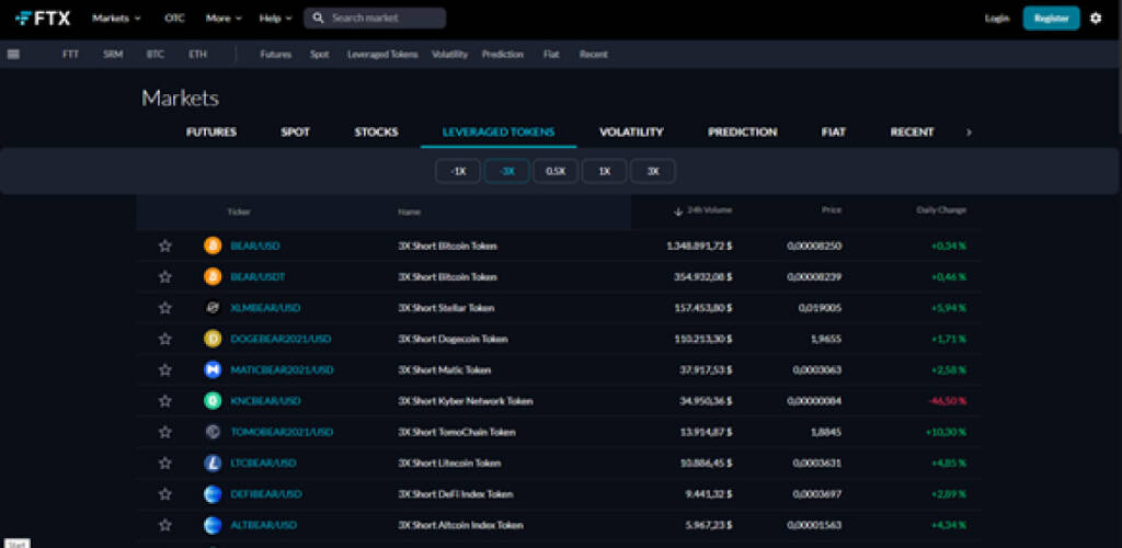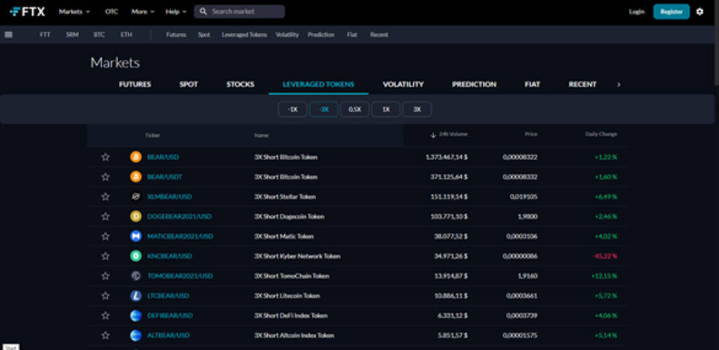 Zu den besonderen Angeboten der Handelsplattform zählen die Leveraged Token. Sie ermöglichen den Handel mehrerer Kryptowährungen mit Hebelwirkung. FTX bietet vier Token-Typen an: