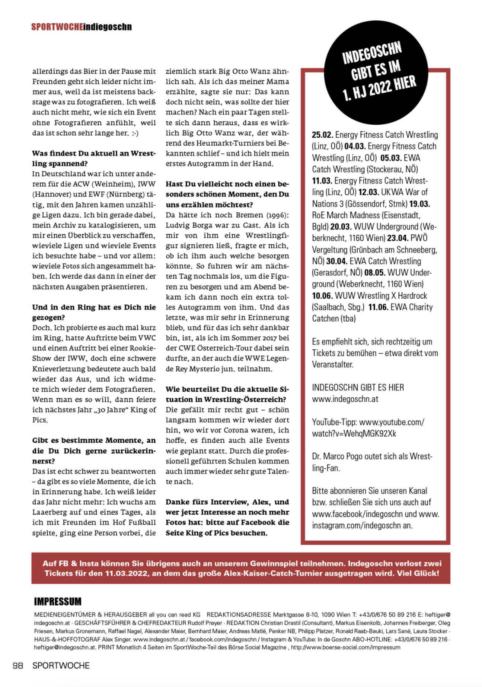 Sehr herzlich darf ich mich namens der Redaktion von Indegoschn daher bei Christian Drastil bedanken – selbst ein ausgewiesener Wrestlingconnoisseur, gibt er uns nun die schöne Möglichkeit, unsere Marke Indegoschn im Rahmen der SportWoche monatlich präsentieren zu dürfen.