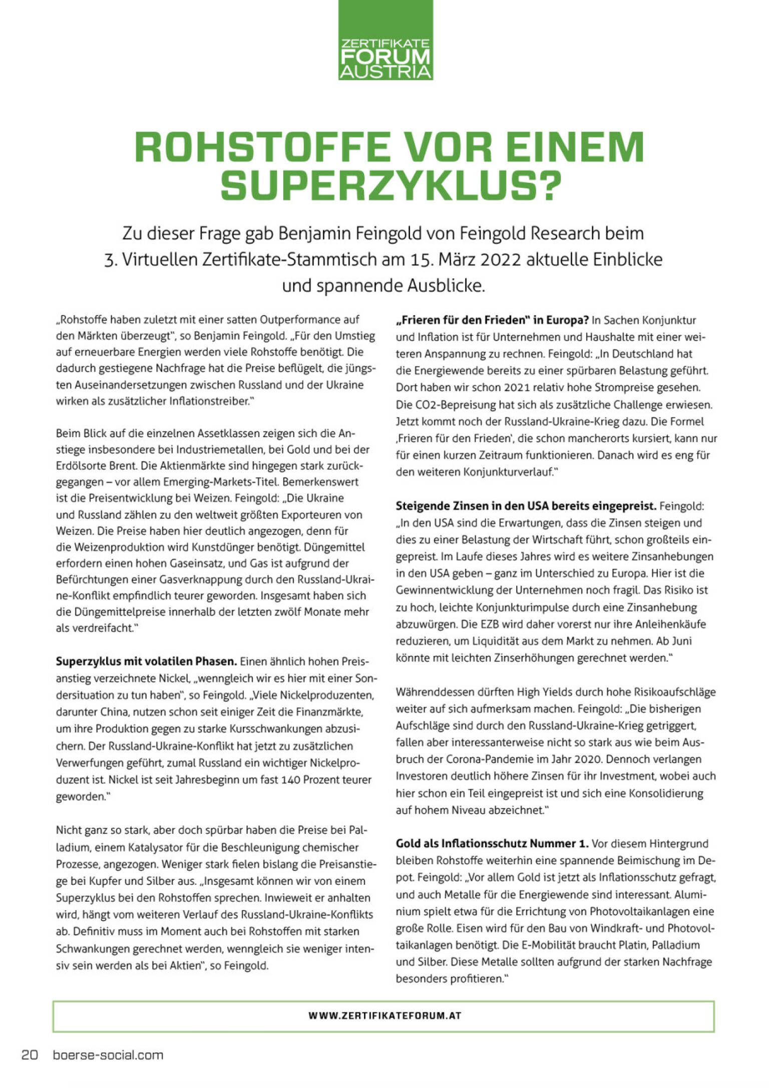 „Rohstoffe haben zuletzt mit einer satten Outperformance auf den Märkten überzeugt“, so Benjamin Feingold. „Für den Umstieg auf erneuerbare Energien werden viele Rohstoffe benötigt. Die dadurch gestiegene Nachfrage hat die Preise beflügelt, die jüngsten Auseinandersetzungen zwischen Russland und der Ukraine wirken als zusätzlicher Inflationstreiber.“