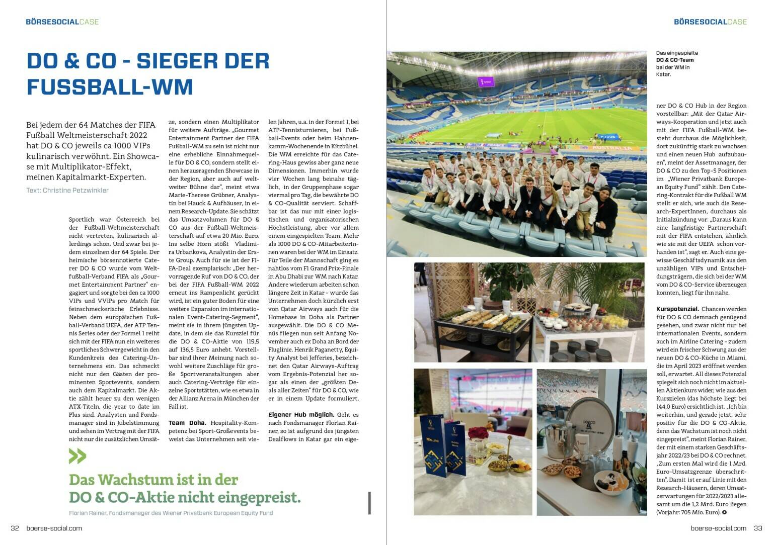 Eigener Hub möglich. Geht es nach Fondsmanager Florian Rainer, so ist aufgrund des jüngsten Dealflows in Katar gar ein eigener DO & CO Hub in der Region vorstellbar: „Mit der Qatar Airways-Kooperation und jetzt auch mit der FIFA Fußball-WM besteht durchaus die Möglichkeit, dort zukünftig stark zu wachsen und einen neuen Hub aufzubauen“, meint der Assetmanager, der DO & CO zu den Top-5 Positionen im „Wiener Privatbank European Equity Fund“ zählt. Den Catering-Kontrakt für die Fußball WM stellt er sich, wie auch die Research-ExpertInnen, durchaus als Initialzündung vor: „Daraus kann eine langfristige Partnerschaft mit der FIFA entstehen, ähnlich wie sie mit der UEFA schon vorhanden ist“, sagt er. Auch eine gewisse Geschäftsdynamik aus den unzähligen VIPs und Entscheidungsträgern, die sich bei der WM vom DO & CO-Service überzeugen konnten, liegt für ihn nahe.