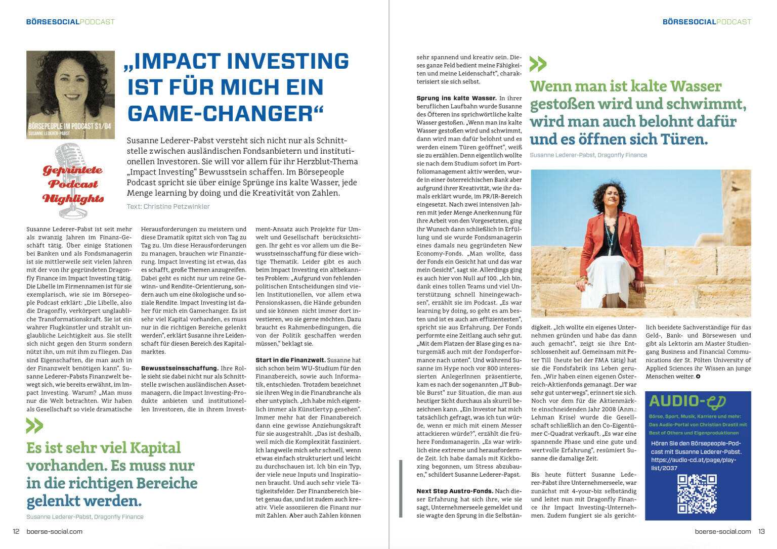 Susanne Lederer-Pabst ist seit mehr als zwanzig Jahren im Finanz-Geschäft tätig. Über einige Stationen bei Banken und als Fondsmanagerin ist sie mittlerweile seit vielen Jahren mit der von ihr gegründeten Dragonfly Finance im Impact Investing tätig. Die Libelle im Firmennamen ist für sie exemplarisch, wie sie im Börsepeople Podcast erklärt: „Die Libelle, also die Dragonfly, verkörpert unglaubliche Transformationskraft. Sie ist ein wahrer Flugkünstler und strahlt unglaubliche Leichtigkeit aus. Sie stellt sich nicht gegen den Sturm sondern nützt ihn, um mit ihm zu fliegen. Das sind Eigenschaften, die man auch in der Finanzwelt benötigen kann“. Susanne Lederer-Pabsts Finanzwelt bewegt sich, wie bereits erwähnt, im Impact Investing. Warum? „Man muss nur die Welt betrachten. Wir haben als Gesellschaft so viele dramatische Herausforderungen zu meistern und diese Dramatik spitzt sich von Tag zu Tag zu. Um diese Herausforderungen zu managen, brauchen wir Finanzierung. Impact Investing ist etwas, das es schafft, große Themen anzugreifen. Dabei geht es nicht nur um reine Gewinn- und Rendite-Orientierung, sondern auch um eine ökologische und soziale Rendite. Impact Investing ist daher für mich ein Gamechanger. Es ist sehr viel Kapital vorhanden, es muss nur in die richtigen Bereiche gelenkt werden“, erklärt Susanne ihre Leidenschaft für diesen Bereich des Kapitalmarktes.