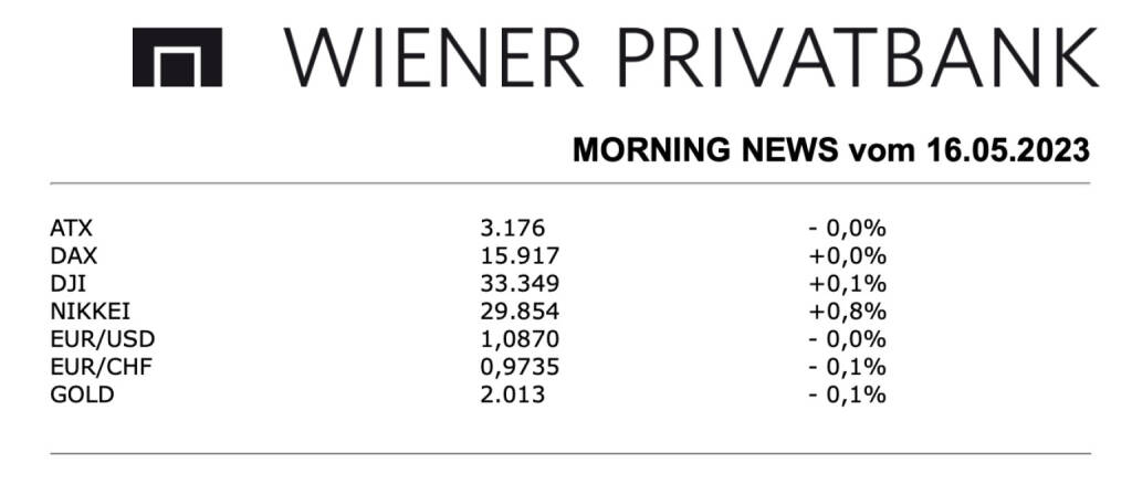 Aus den Morning News der Wiener Privatbank: "Die Wiener Börse hat am Montag mit nur wenig veränderter Tendenz geschlossen. Der ATX fiel geringfügig um 0,02% und fand ebenso wie das europäische Börsenumfeld zu Wochenbeginn keine klare Richtung. Allgemein wurde von einem verhaltenen Geschäft gesprochen, auch bedingt durch die dünne Meldungslage. Weiter im Fokus stand neben Konjunkturnachrichten auch der Streit um eine Erhöhung der US-Schuldenobergrenze, der Anfang Juni drohende Zahlungsausfall der Vereinigten Staaten rückt von Tag zu Tag näher, aber noch lassen sich die Anleger von diesem Schreckensszenario nicht wirklich beunruhigen. Die Produktion in den Industrieunternehmen der Eurozone ist im März kräftig gesunken und wurde deutlich niedriger als allgemein angenommen gemeldet, aber auch das hatte nur wenig Auswirkungen auf die Investoren.