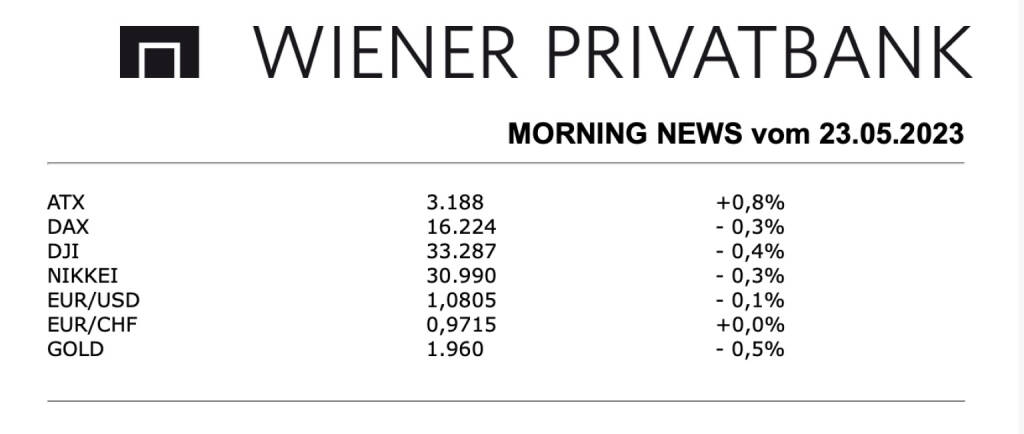 Aus den Morning News der Wiener Privatbank: "Zuwächse gab es zum Start in die neue Woche für den heimischen Markt, der ATX konnte sich im Gegensatz zu den meisten europäischen Börsen um 0,8% steigern. Die Meldungslage zu den einzelnen Unternehmen gestaltete sich wieder äußerst mager, überhaupt war der Handel sehr ruhig und von wenig Bewegung gekennzeichnet. Auch datenseitig fehlten nennenswerte Impulse, die Stimmung der Verbraucher in der Eurozone hat sich im Mai etwas aufgehellt, wie am Nachmittag bekannt gegeben wurde, das Barometer für das Konsumklima kletterte um 0,1 Punkte auf minus 17,4 Zähler, allerdings hatten Volkswirte im Durchschnitt einen Anstieg auf minus 16,8 Zähler erwartet. Gestützt wurde der ATX von den großen heimischen Bankentiteln, die Bawag konnte sich um 2,2% verbessern, für die Erste Group gab es einen deutlichen Anstieg von 3,4% und die Raiffeisen Bank International konnte mit einer 1,0% höheren Notierung aus dem Handel gehen. Keine einheitliche Richtung fanden die Ölwerte, während es für die OMV einen Zuwachs von 0,8% gab, musste Schoeller-Bleckmann nachgeben, der Ölfeldausrüster endete mit einem Abschlag von 0,6%. Leicht zulegen konnte die Bauwerte, für Porr gab es eine Verbesserung von 0,5%, Strabag konnte um 0,6% vorrücken.