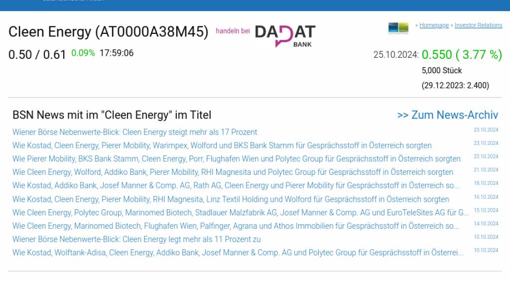 Cleen Energy am 25.10. 3,77%, Volumen 85% normaler Tage