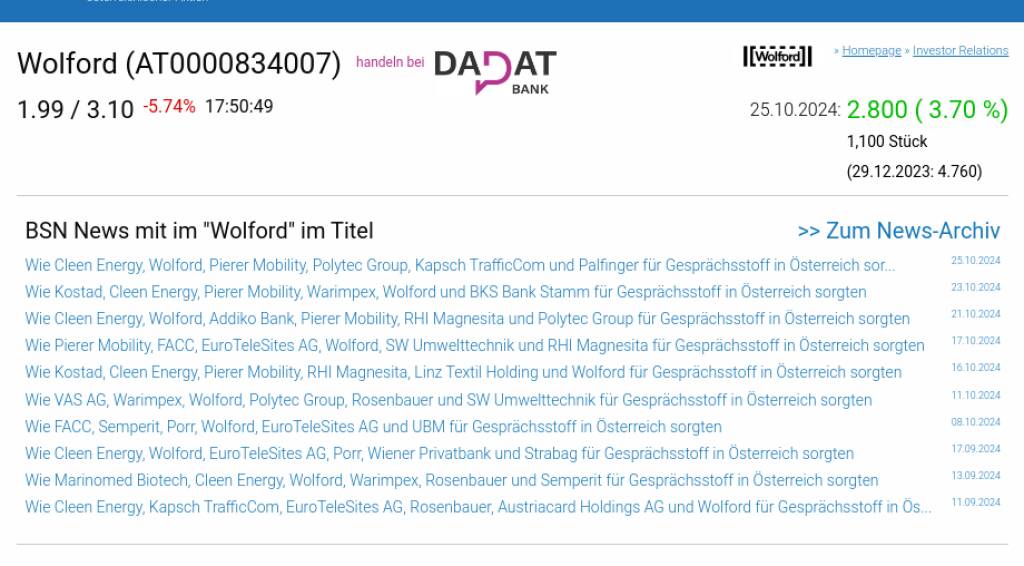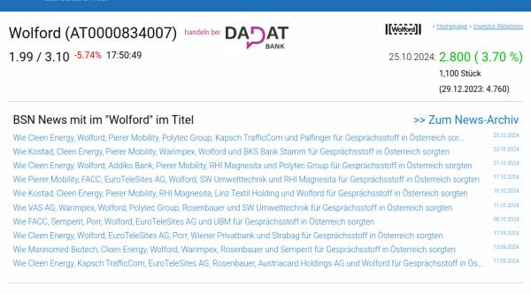 Wolford am 25.10. 3,70%, Volumen 74% normaler Tage