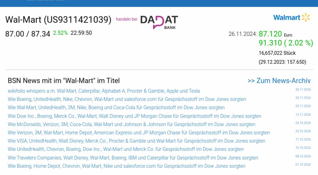 Wal-Mart am 26.11. 2,02%, Volumen 114% normaler Tage