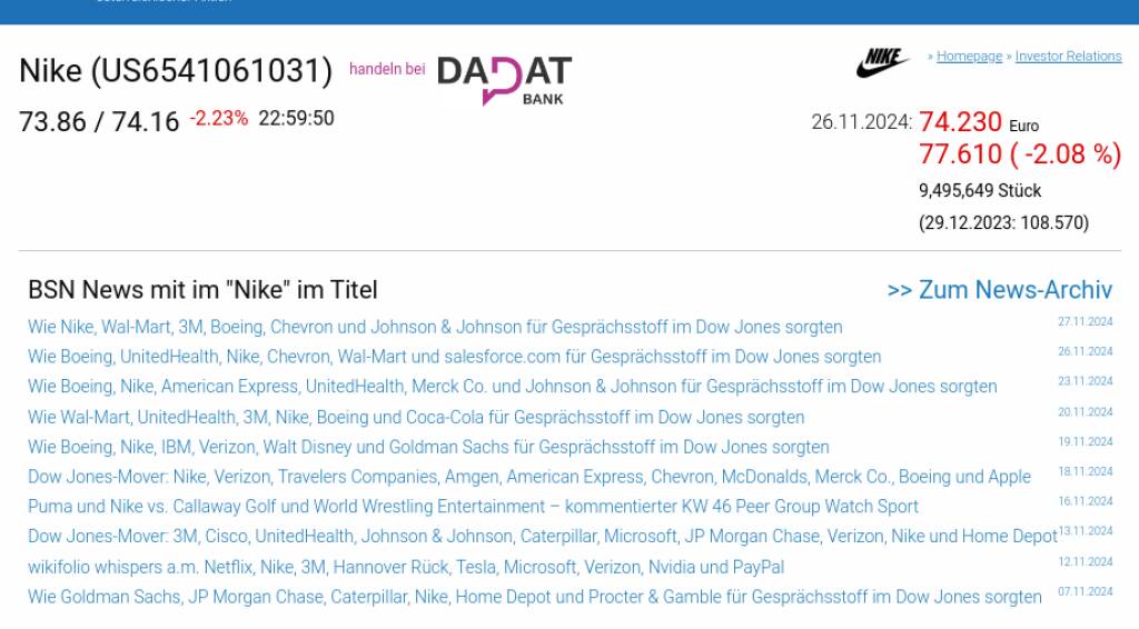 Nike am 26.11. -2,08%, Volumen 82% normaler Tage
