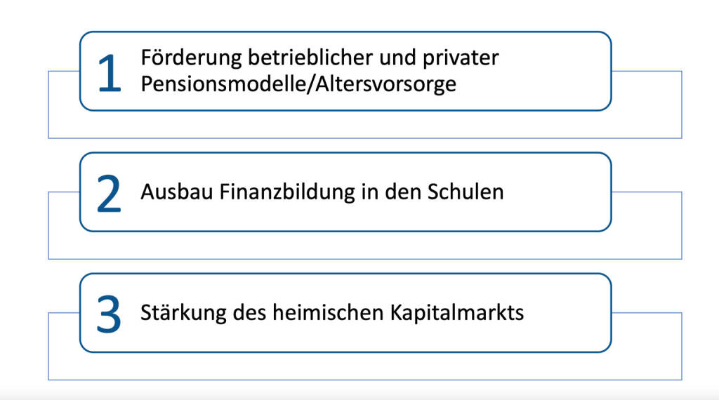 Die Initiative Kapitalmarkt Österreich erneuert ihre Forderungen und appelliert an die derzeitigen Regierungs-Verhandlungspartner FPÖ und ÖVP, die Stärkung der privaten Vorsorge als zentrales Thema in das Regierungsprogramm aufzunehmen. Gefordert werden die Weiterentwicklung der Rahmenbedingungen für die 2. Säule, ein steuerbegünstigtes Vorsorgedepot, der Ausbau der Finanzbildung sowie die Stärkung des heimischen Kapitalmarkts durch u.a. die Wiedereinführung der Behaltefrist und Maßnahmen bei der Wertpapier-KESt, die Förderung von Mitarbeiter:innen-Beteiligungsmodellen, die Vereinfachung von Kapitalerhöhungen und steuerliche Gleichbehandlung von Eigen- und Fremdkapital. Fritz Mostböck, Präsident der ÖVFA und Mitinitiator der Initiative. „Investition in Kapitalmärkte bietet privaten Anlegern für ihr Arbeitsleben langfristig vorzusorgen und gleichzeitig das Budget für eine gesunde Wirtschaft und Wohlstand nachhaltig zu entlasten." „Bei der privaten Altersvorsorge besteht Handlungsbedarf. In der aktuellen Vorsorgestudie geht nur ein Viertel der befragten Österreicher:innen davon aus, dass die staatliche Pension im Alter ausreichend sein wird“, ergänzt Paul Severin, Vorstandsmitglied der ÖVFA. Stefan Maxian, Vorstandsmitglied der ÖVFA erläutert: „Die Stärkung der Eigenkapitalbasis österreichischer Unternehmen ist eine wesentliche Voraussetzung für mehr Wohlstand und Wirtschaftswachstum“.