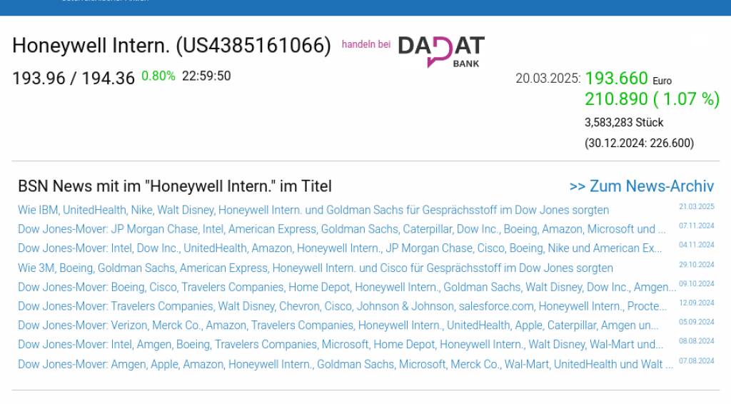 Honeywell Intern. am 20.3. 1,07%, Volumen 83% normaler Tage