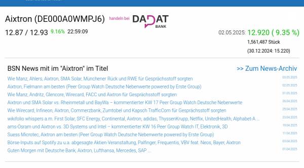 Aixtron am 2.5. 9,35%, Volumen 156% normaler Tage