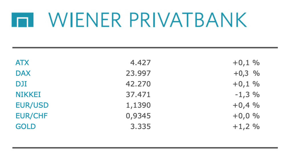 Aus den Morning News der Wiener Privatbank: "Der Wiener Aktienmarkt hat den Handel am Freitag praktisch unverändert beendet und behauptete damit ein klares Wochenplus. Der ATX schloss mit einem geringen Anstieg von 0,06 Prozent auf 4.426,79 Punkte - auf Wochensicht legte der ATX rund ein Prozent zu. Der ATX Prime ermäßigte sich hingegen um 0,03 Prozent auf 2.219,97 Punkte. Auch an anderen Börsen gab es nur wenig Bewegung. Für Unsicherheit sorgte dabei weiter die US-Zollpolitik. Ein US-Berufungsgericht hat die von einer niedrigeren Instanz angeordnete Blockade fast aller Zölle von US-Präsident Donald Trump zuletzt wieder aufgehoben. Zum Wochenausklang warf Trump zudem China vor, sich nicht an eine Vereinbarung mit den USA im laufenden Handelsstreit zu halten. Die am Freitag gemeldeten Inflationsdaten aus Europa waren mit Hinblick auf die anstehende EZB-Zinsentscheidung zwar mit Spannung erwartet worden, wirkten sich letztlich aber nicht deutlich im Aktienhandel aus. Marktteilnehmer gehen derzeit mehrheitlich davon aus, dass die Notenbank den Leitzins in dieser Woche um weitere 0,25 Prozentpunkte senken wird.