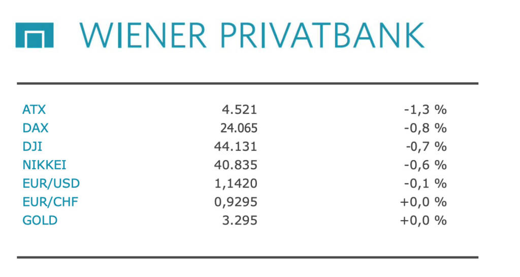 Aus den Morning News der Wiener Privatbank: "Der Wiener Aktienmarkt hat gestern Donnerstag den Handel klar im Minus beendet. Der Leitindex ATX stand am Ende des Handelstages 1,34 Prozent niedriger bei 4.521,4 Punkten. Der marktbreitere ATX Prime verlor ähnlich und notierte 1,31 Prozent tiefer bei 2.269,6 Zählern. Auch andere europäische Börsen gingen mit Verlusten aus dem Handel. Mehrere Zahlenvorlagen standen im Fokus. Die US-Notenbank Fed hat das Leitzinsniveau - wie von Marktbeobachtern erwartet - nicht verändert und das Leitzinsband bei 4,25 bis 4,5 Prozent belassen. Fed-Chef Powell ließ zwar grundsätzlich die Bereitschaft zu niedrigeren Zinsen erkennen, eine konkrete Ankündigung für den Septembertermin gab es aber nicht. Ein Septemberschritt ist jetzt zu rund 45 Prozent eingepreist, nach zuletzt fast 70 Prozent.