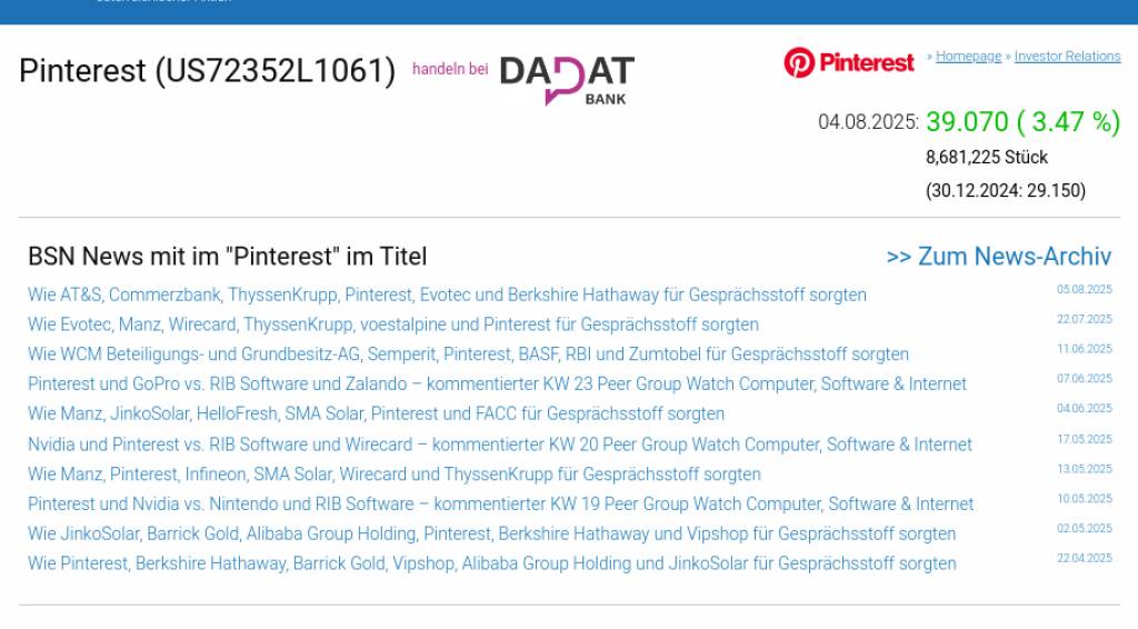 Pinterest am 4.8. 3,47%, Volumen 74% normaler Tage