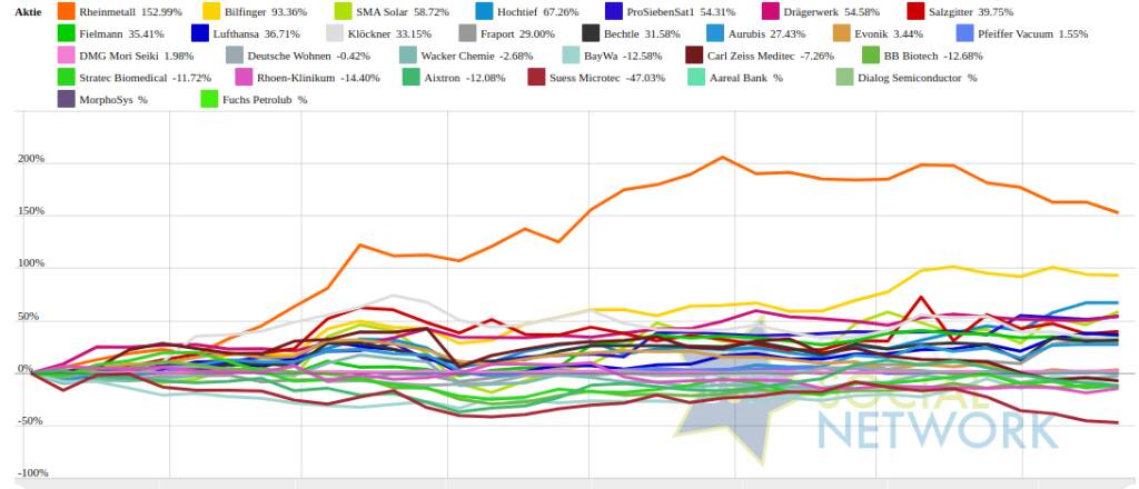 Year-to-date lag per letztem Schlusskurs Rheinmetall 153,42% (Vorjahr: 114,15 Prozent) im Plus. Dahinter MorphoSys 99,26% (Vorjahr: 157,38 Prozent) und Bilfinger 97,73% (Vorjahr: 32,83 Prozent). Suess Microtec -45,32% (Vorjahr: 75,63 Prozent) im Minus. Dahinter Aixtron -15,64% (Vorjahr: -60,63 Prozent) und Rhoen-Klinikum -14,39% (Vorjahr: 39 Prozent).