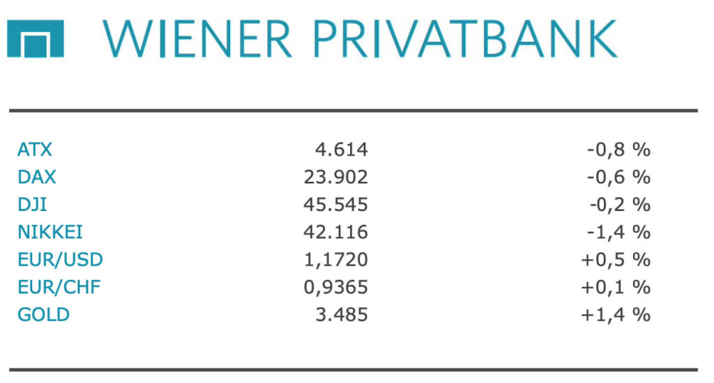Aus den Morning News der Wiener Privatbank: "Der Wiener Aktienmarkt hat die Handelswoche mit Verlusten geschlossen. Am Freitag verzeichnete der Leitindex ATX einen Rückgang um 0,8 Prozent auf 4.614,4 Punkte. Dies führte zu zu einem Wochenminus von 3,6 Prozent. Nur wenige Titel legten am Freitag zu. Der mehr Aktien umfassende ATX Prime verlor in gleichem Ausmaß 0,8 Prozent auf 2.304,5 Zähler. Die Marktteilnehmer liesen es vor dem langen Wochenende in den USA ruhig angehen. Die am Freitag gemeldeten Inflationsdaten wirkten sich nicht merklich aus. Getrübt wird die Börsenstimmung aber weiter von den geopolitischen Unsicherheiten rund um den Ukraine-Krieg und die US-Zollpolitik. In Deutschland hat sich das Leben im August wieder stärker verteuert. Die Verbraucherpreise lagen 2,2 Prozent über dem Niveau des Vorjahresmonats. Überraschend konstant blieb die Inflationsrate im August hingegen in Italien, wo die Verbraucherpreise auf Jahressicht erneut um 1,7 Prozent stiegen.