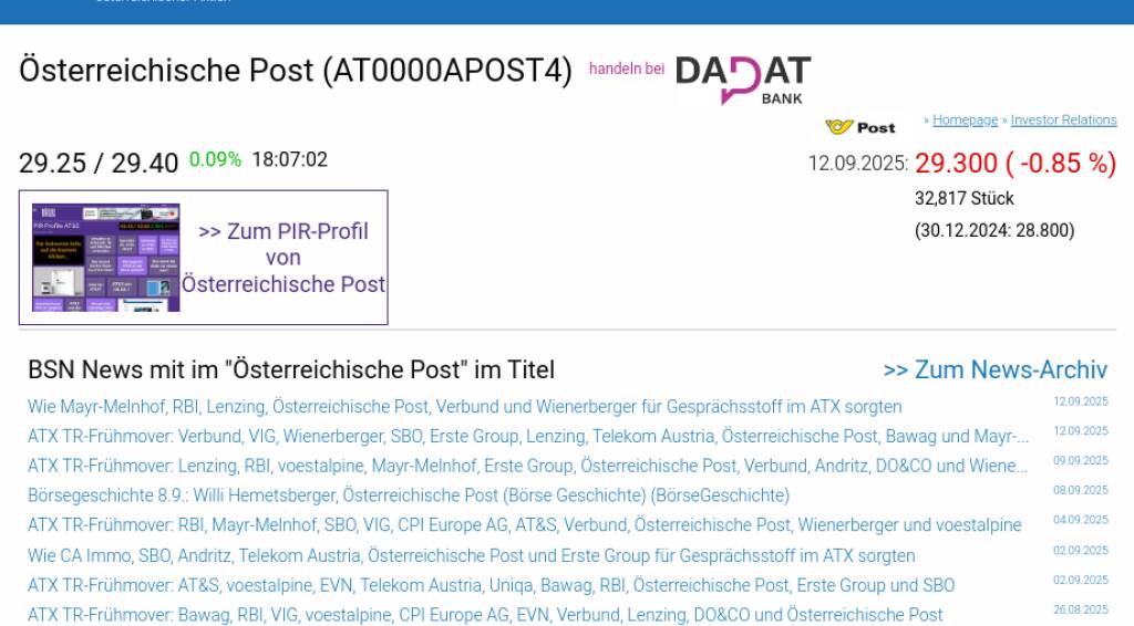 Österreichische Post am 12.9. -0,85%, Volumen 88% normaler Tage