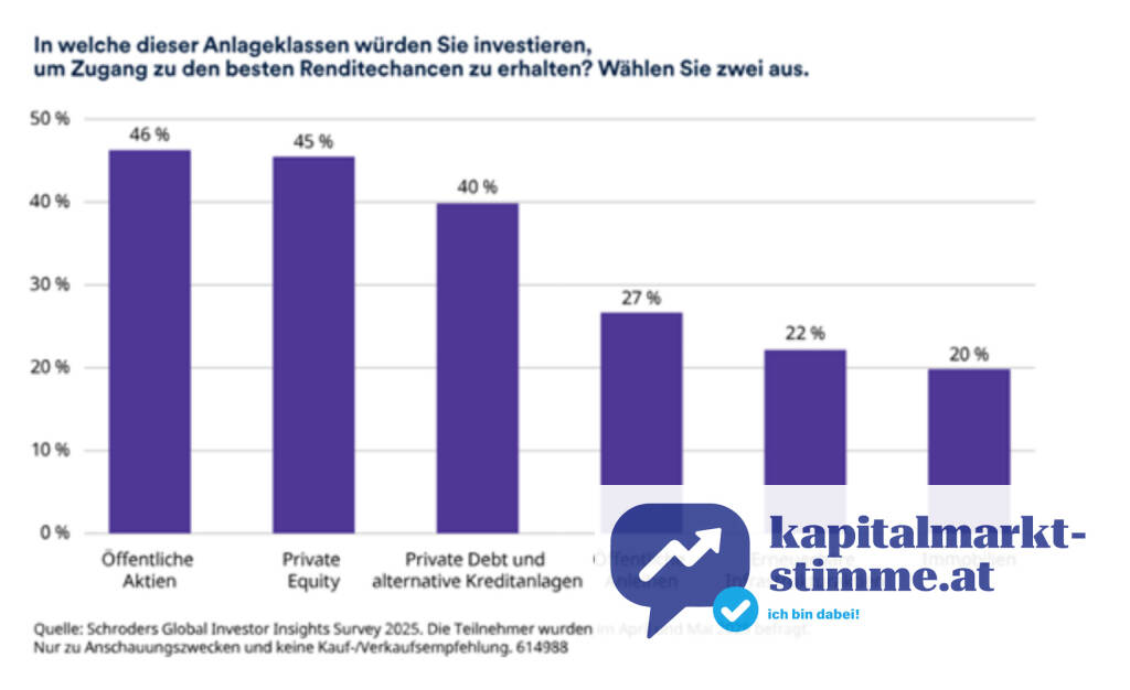 Laut Schroders Global Investor Insights Survey sind Anleger der Überzeugung, dass Aktien das beste Renditepotenzial unter den großen Anlageklassen bieten. So sind diese für 46 % der Befragten die erste Wahl, knapp vor Private Equity (45 %). Zu diesem Schluss kamen die Befragten trotz der Volatilität an den Aktienmärkten, die während des Umfragezeitraums zu beobachten war, denn die Umfrage wurde im April und Mai 2025 während der Zollankündigungen zum „Tag der Befreiung“ durchgeführt. Alex Tedder, CIO Equities bei Schroders, meint: „In einem Markt, der alles andere als vorhersehbar ist, wenden sich Anleger dem zu, was sie kennen: Aktien. Nicht aus Gewohnheit, sondern weil die Anlageklasse die notwendige Agilität und globale Reichweite bietet, um die Komplexität zu bewältigen und die Performance zu steigern.“