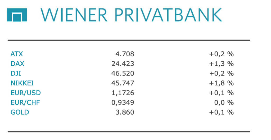 Aus den Morning News der Wiener Privatbank: "Die Wiener Börse hat sich am Donnerstag mit leichten Gewinnen aus dem Handel verabschiedet. Der österreichische Leitindex ATX legte 0,18 Prozent auf 4.708,02 Punkte zu. Der mehr Aktien umfassende ATX Prime schloss ebenfalls 0,18 Prozent im Plus bei 2.353,39 Zählern. An anderen europäischen Börsen wurden deutlichere Gewinne verzeichnet.