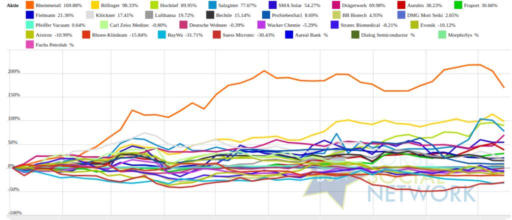 Rheinmetall 170,34% (Vorjahr: 114,15 Prozent) im Plus. Dahinter