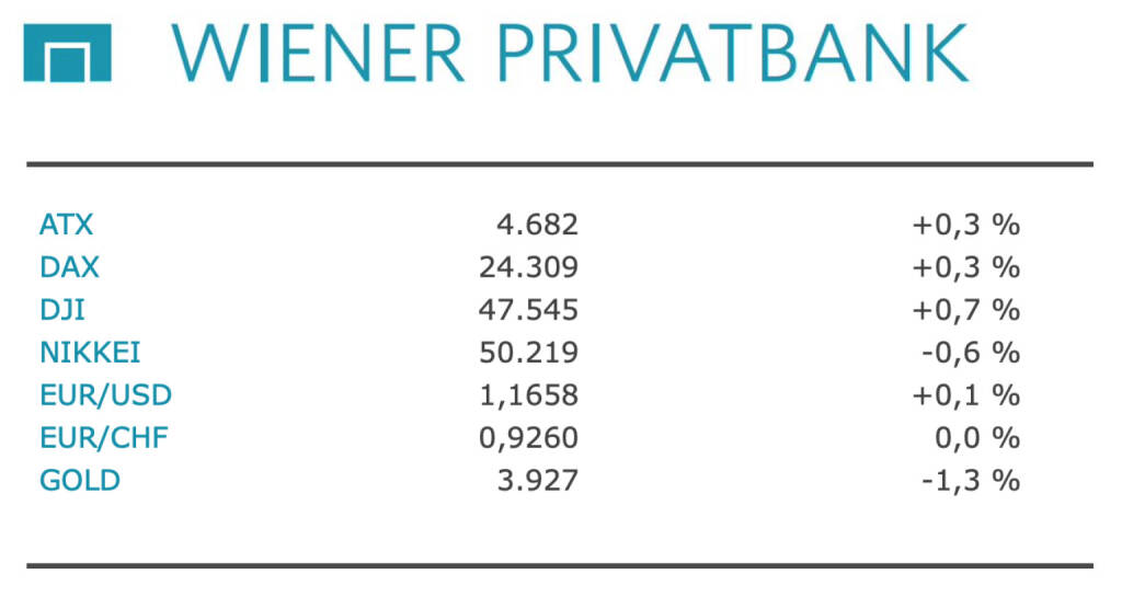 Aus den Morning News der Wiener Privatbank: "Der Wiener Aktienmarkt hat den Handel am Montag mit moderaten Kursaufschlägen beendet. Anleger dürften sich vor den wichtigen Notenbankentscheidungen im Lauf der Woche zurückgehalten haben. Zugleich sorgten Entspannungssignale im Handelsstreit zwischen den USA und China für etwas Optimismus. Der ATX schloss 0,34 Prozent höher mit 4.682,14 Punkten. Für den ATX Prime, der die Entwicklung einer breiteren Palette an Aktien wiedergibt, kletterte um 0,30 Prozent auf 2.338,73 Zähler.