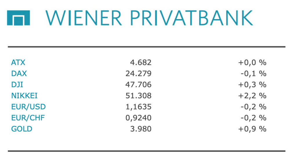 Aus den Morning News der Wiener Privatbank: "Die Wiener Börse hat gestern Dienstag behauptet geschlossen. Der ATX beendete den Tag mit einem kleinen Plus bei 4.682,31 Zählern. Der breiter gefasste ATX Prime sank minimal um 0,05 Prozent auf 2.337,62 Punkte. Auch an anderen Börsen in Europa gab es nur wenig Bewegung. Viele Anleger dürften die im Wochenverlauf anstehenden Zinsentscheidungen der US-Notenbank Fed und der EZB abwarten.