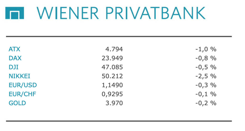 Aus den Morning News der Wiener Privatbank: "Die Wiener Börse hat gestern Dienstag in einem schwachen Börsenumfeld nachgegeben. Der ATX notierte zum Handelsende 0,96 Prozent leichter bei 4.794,36 Punkten. Für den ATX Prime ging es 1,05 Prozent auf 2.384,39 Zähler hinab.
