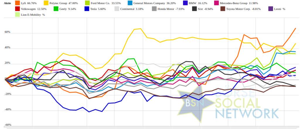 Weitere Highlights: Honda Motor ist nun 4 Tage im Plus (4,74% Zuwachs von 8,39 auf 8,79), ebenso Leoni 3 Tage im Minus (77,69% Verlust von 0,13 auf 0,03), Geely 3 Tage im Minus (3,45% Verlust von 2 auf 1,93), Tesla 3 Tage im Minus (9,18% Verlust von 445,23 auf 404,35).