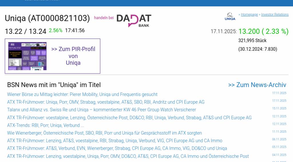 Uniqa am 17.11. 2,33%, Volumen 193% normaler Tage