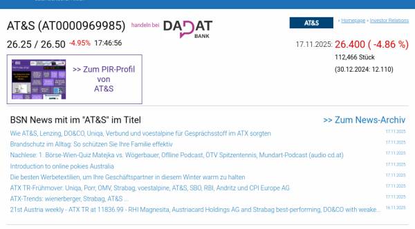 AT&S am 17.11. -4,86%, Volumen 85% normaler Tage