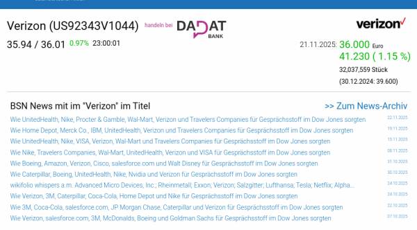Verizon am 21.11. 1,15%, Volumen 142% normaler Tage