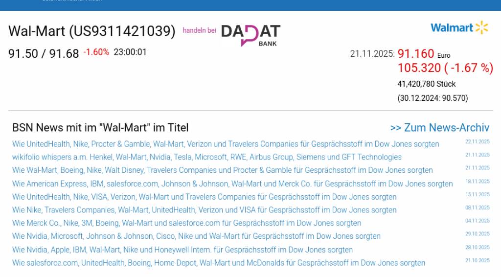 Wal-Mart am 21.11. -1,67%, Volumen 224% normaler Tage