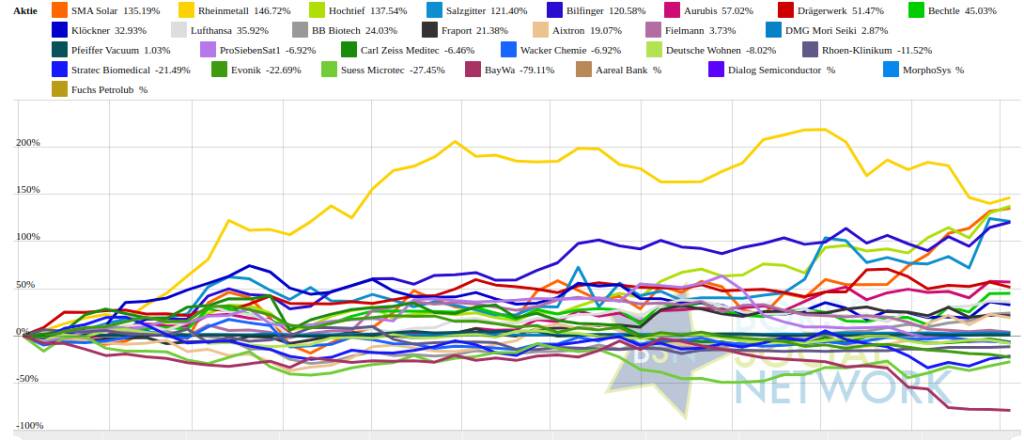 In der Monatssicht ist vorne: SMA Solar 35,05% vor Suess Microtec 30,63% , Hochtief 26,47% , Aixtron 25,33% , Salzgitter 24,96% , Bechtle 18,4% , BB Biotech 10,58% , Bilfinger 8,56% , Lufthansa 8,06% , Fuchs Petrolub 7,24% , Klöckner 6,68% , Aurubis 5,05% , Dialog Semiconductor 3,63% , Rhoen-Klinikum 2,5% , Aareal Bank 0,3% , DMG Mori Seiki 0,21% , MorphoSys 0,15% , Pfeiffer Vacuum -0,26% , Stratec Biomedical -0,64% , Carl Zeiss Meditec -1,91% , Deutsche Wohnen -2,78% , Fraport -2,96% , Wacker Chemie -4,38% , Drägerwerk -6,99% , ProSiebenSat1 -9,25% , Fielmann -9,4% , Rheinmetall -10,73% , Evonik -12,04% , BayWa -51,46% und