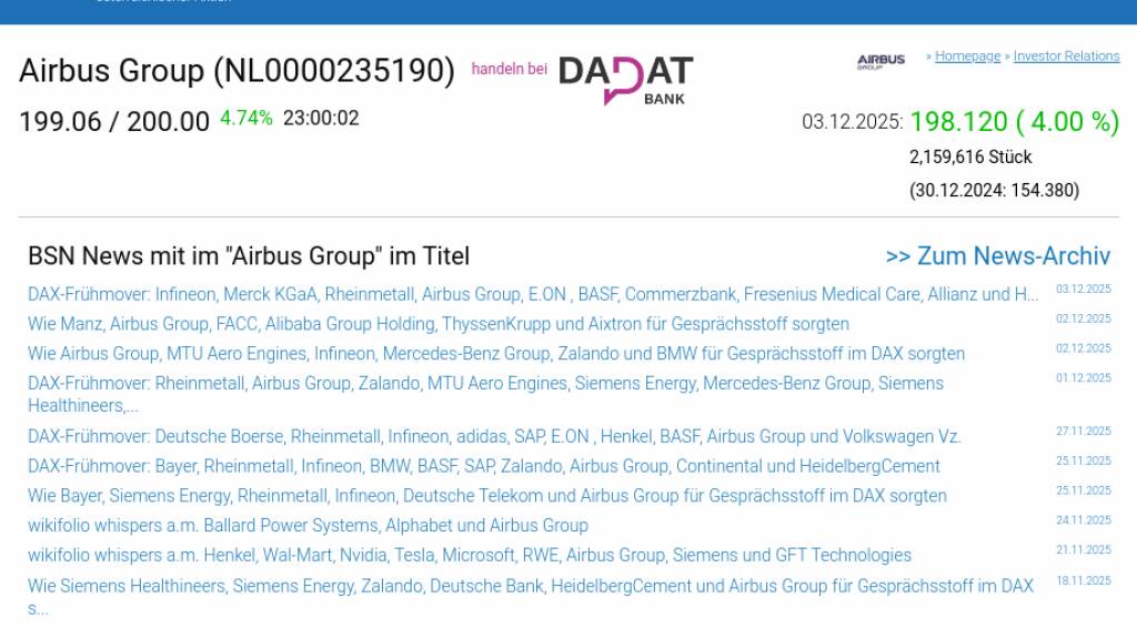 Airbus Group am 3.12. 4,00%, Volumen 192% normaler Tage