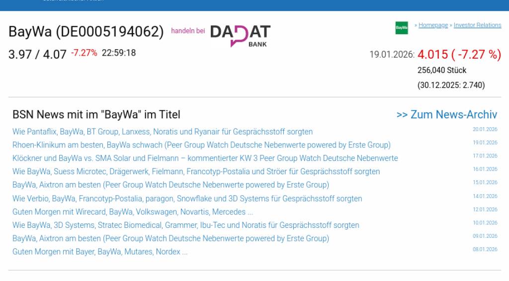 BayWa am 19.1. -7,27%, Volumen 62% normaler Tage