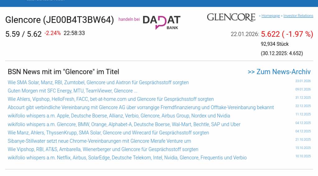 Glencore am 22.1. -1,97%, Volumen 85% normaler Tage