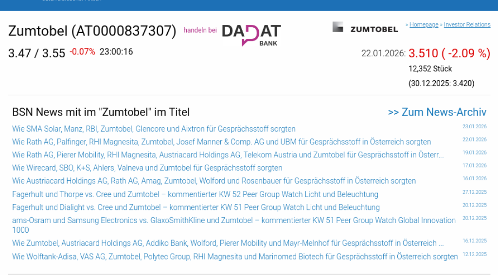 Zumtobel am 22.1. -2,09%, Volumen 40% normaler Tage