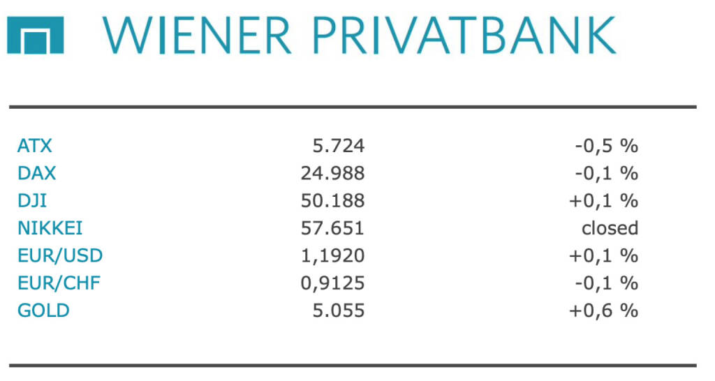 Aus den Morning News der Wiener Privatbank: "Der Wiener Aktienmarkt hat sich gestern Dienstag mit Abschlägen aus dem Handel verabschiedet. Der ATX gab 0,51 Prozent auf 5.724,31 Punkte ab und konnte nicht an den Rekordlauf von Montag anschließen. Der ATX Prime verlor 0,45 Prozent auf 2.844,45 Einheiten. Die europäischen Leitbörsen gingen ebenfalls mit einem Minus aus dem Tag. Im Fokus war der steirisch-deutsche Elektronikkonzern ams-Osram, der an der schweizerischen Börse notiert ist. ams-Osram hat das Geschäftsjahr 2025 erneut mit roten Zahlen abgeschlossen, den Verlust aber massiv eingedämmt. Gleichzeitig kündigte der Konzern ein neues Sparprogramm an. Das sorgte für Kursgewinne von 5,6 Prozent.