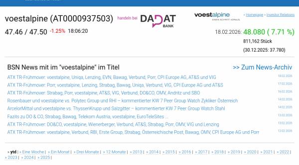 Der Stahl- und Verarbeitungskonzern Voestalpine hat in den ersten drei Quartalen 2025/26 trotz eines Umsatzrückgangs seinen Gewinn gesteigert. Das Ergebnis nach Steuern kletterte um gut 25 Prozent auf 259 Mio. Euro. Das Ergebnis vor Zinsen, Steuern und Abschreibungen (Ebitda) legte um 7,2 Prozent auf eine Mrd. Euro zu. Der Umsatz sank hingegen um 5,1 Prozent auf 11,1 Mrd. Euro. Den Ausblick für das bis Ende März laufende Gesamtjahr bekräftigte Voestalpine: Das Ebitda soll um bis zu 15 Prozent auf 1,4 Mrd. bis 1,55 Mrd. Euro steigen. Während die Nachfrage in den Bereichen Eisenbahninfrastruktur, Luftfahrt und Lagertechnik gut lief, verharrte sie in der Bau- und Maschinenbauindustrie stabil auf niedrigem Niveau. Doch genau hier liegt der Hebel. Wer noch Aktien hat, kann dabeibleiben. | |||