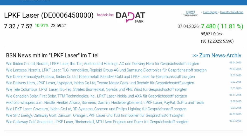 LPKF Laser am 7.4. 11,81%, Volumen 164% normaler Tage