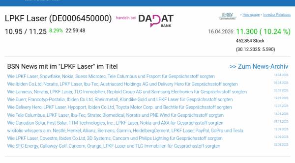 LPKF Laser am 16.4. 10,24%, Volumen 513% normaler Tage