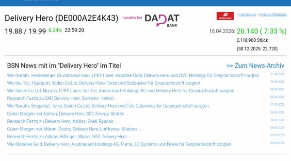 Delivery Hero am 16.4. 7,33%, Volumen 167% normaler Tage