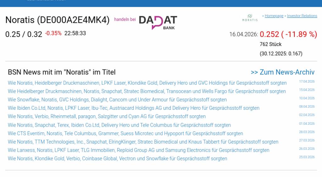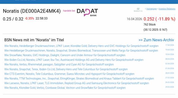 Noratis am 16.4. -11,89%, Volumen 6% normaler Tage