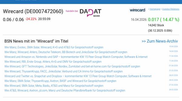 Wirecard am 16.4. 14,47%, Volumen 9% normaler Tage
