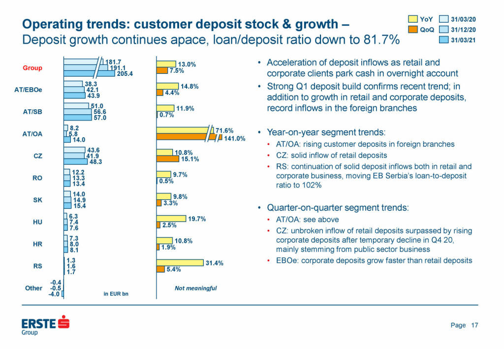 „ Erste Group - Operating trends: customer deposit stock & growth “