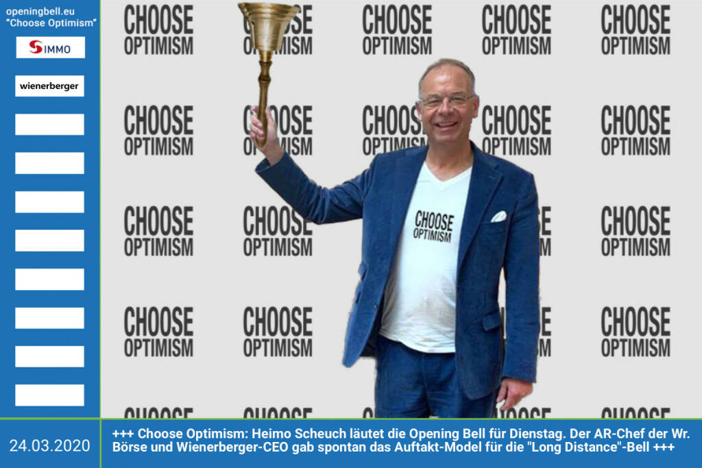 24.3.: Choose Optimism: Heimo Scheuch läutet die Opening Bell für Dienstag. Der Aufsichtsrats-Chef der Wiener Börse und Wienerberger-CEO gab spontan das Auftakt-Model für die "Long Distance"-Bell mit Choose Optimism. http://www.wienerberger.com . Mehr Infos unter http://www.openingbell.eu https://www.facebook.com/chooseoptimism/