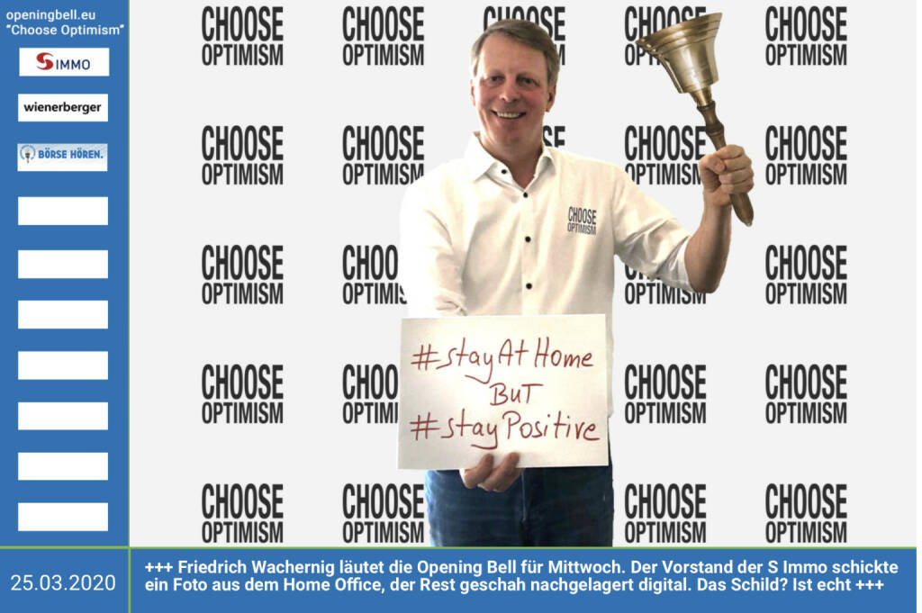 25.3.: Friedrich Wachernig läutet die Opening Bell für Mittwoch. Der Vorstand der S Immo schickte uns ein Foto aus dem Home Office, der Rest geschah nachgelagert digital. Das Schild ist freilich echt. https://www.simmoag.at mehr Infos unter http://www.openingbell.eu mehr Choose Optimism: https://boerse-social.com/category/choose_optimism https://www.facebook.com/chooseoptimism/