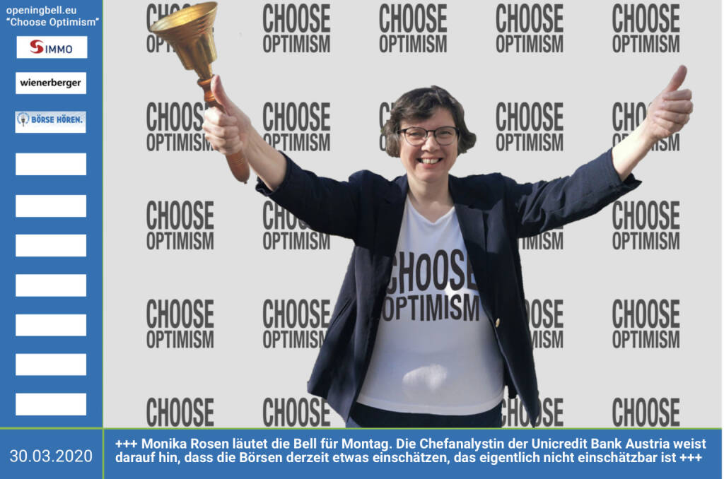 30.3.: Monika Rosen läutet die Opening Bell für Montag, Long Distance Style (vorher/nachher unter https://photaq.com//page/index/3781 ). Die Chefanalystin der Unicredit Bank Austria weist darauf hin, dass die Börsen derzeit etwas einschätzen, das eigentlich nicht einschätzbar ist mehr Infos unter http://www.openingbell.eu mehr Choose Optimism: https://boerse-social.com/category/choose_optimism https://www.facebook.com/chooseoptimism/